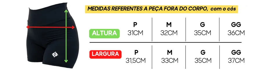 Abaixo preparamos uma tabela de medidas do short FORA DO CORPO, assim você pode comparar as medidas com um short que você já use!